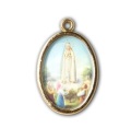 金箔押両面メダイ 金色の金属製の両面メダルで、片面にはファティマの聖母と子どもたちの樹脂像が、もう片面には大聖堂が描かれています。どちらの画像もホットゴールドのディテールで充実しています。メダルには金色の留めリングがすでに取り付けられた状態で提供されます。
