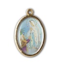 金箔押両面メダイ 金色の金属製の両面メダルで、片面にはルルドご出現の聖母が、もう片面にはルルド大聖堂が描かれています。どちらの画像もホットゴールドのディテールで充実しています。メダルには金色の留めリングがすでに取り付けられた状態で提供されます。