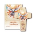 堅信式を記念する木製の十字架と証明書。聖体の秘跡を象徴する装飾が施され、貴重な金色の細部で彩られています。