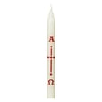 19cmのテーパーキャンドル。 アイボリー テーパー キャンドルには、赤いアルファ オメガ文字があり、中央と端に四角が付いています。キャンドルのサイズは高さ19cm、直径1.6cmです。ドイツの歴史あるワックス工場で作られています。 出荷重量: 0.2Kg 材質:パラフィン 原産地:ドイツ 高さ19cm 直径2cm お通夜式 ご葬儀 ご遺体に添う形で灯せる復活ロウソクです。 原料高騰と円安の為、高額となってしまっております。申し訳ございません。